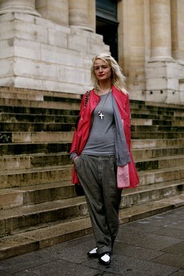 黑白相间的牛津鞋算是蛮常见的牛津鞋款,除了可以搭配洋装外,搭配裤装更是可以充分展现帅劲,像图片中的第一个女孩,穿着皮衣,戴着率性的小偷帽,着一条上宽下窄的裤子,披上链带,十足帅气。第二位法国女子,一身灰色系裤装,穿上黑白牛津鞋,也是充份展现中性时尚气质的一面。