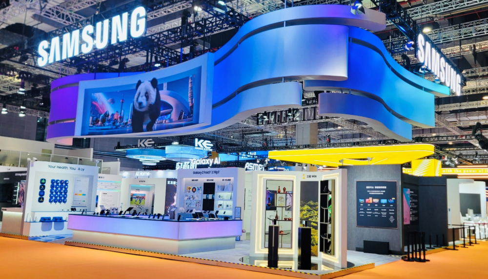 在展台设计与搭建过程中,三星积极响应进博会“绿色办展”号召:采用LED与新能源照明降低能耗,优先使用可再生回收材料,主体结构应用免喷涂环保饰面,并严格选用低VOC材料,最大限度减少环境污染。