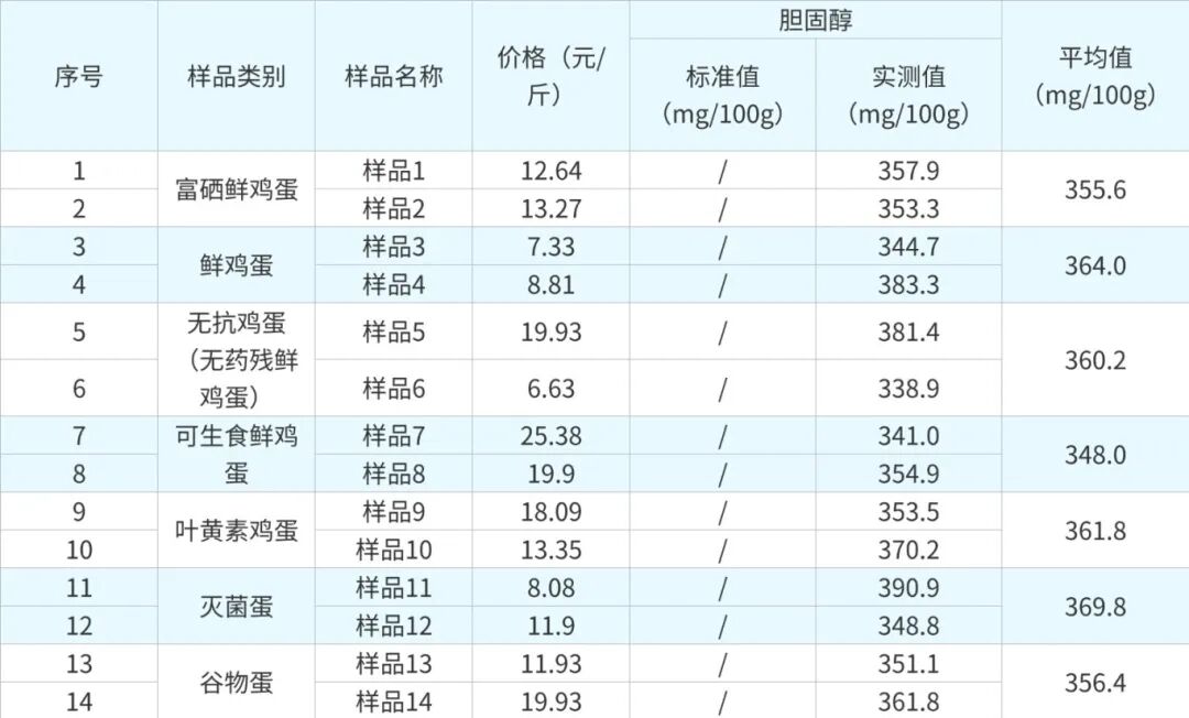 14批次鸡蛋样品胆固醇含量测试结果。(数据来源:吉林省消协)