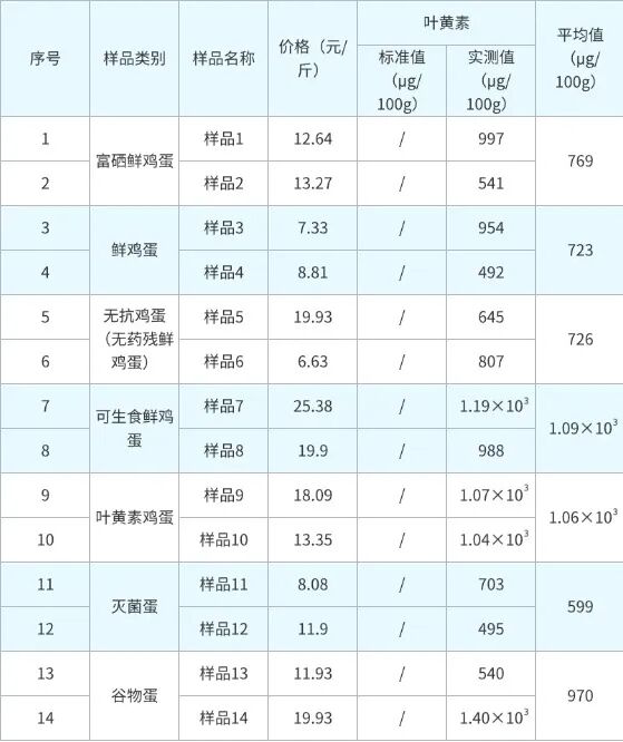 14批次鸡蛋样品叶黄素含量测试结果。(数据来源:吉林省消协)