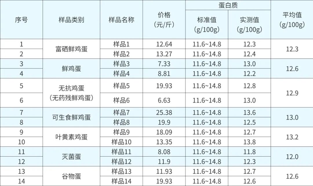 14批次鸡蛋样品蛋白质含量测试结果。(数据来源:吉林省消协)