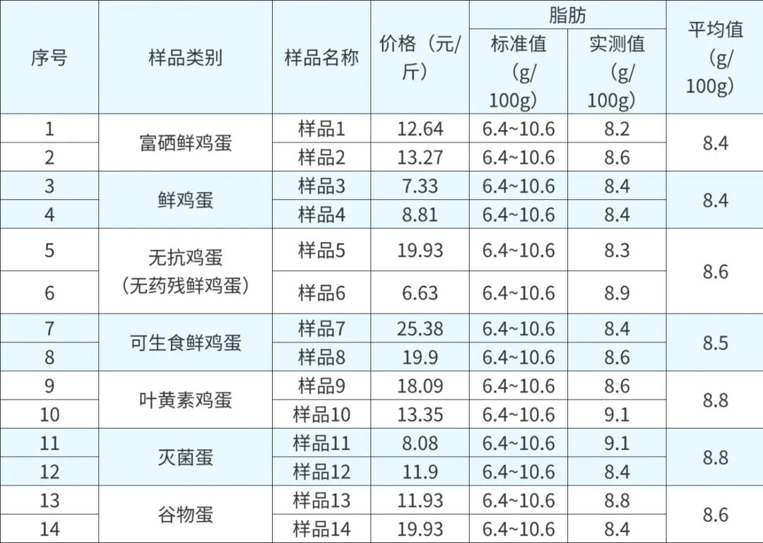 14批次鸡蛋样品脂肪含量测试结果。(数据来源:吉林省消协)