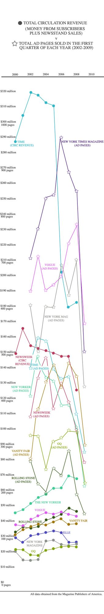 从图上可以看出,杂志的广告收入在过去两年中大幅缩水,出现了所谓“坠崖”般的下滑。同样也可以看到,在2000年后,杂志广告收入开始膨胀。但到09年时,没有一家杂志的广告收入高于2001年的水平。