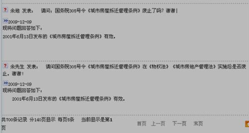 本报讯 (记者杨华云)国务院法制办网站前日在“在线互动”栏目的“留言板”中,回复网民“余先生”“余地”所提的“物权法生效后《拆迁条例》是否废止”的问题时,称:“2001年6月13日发布的《城市房屋拆迁管理条例》有效。”