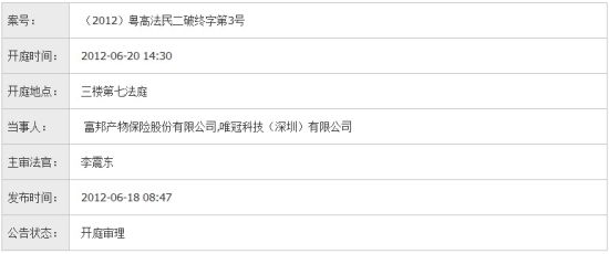 广东省高级人民法院的公开信息显示,本周三(6月20日)富邦公司申请深圳唯冠破产案将在广东高院第七法庭开庭,届时将决定深圳唯冠是否会被破产清算。
