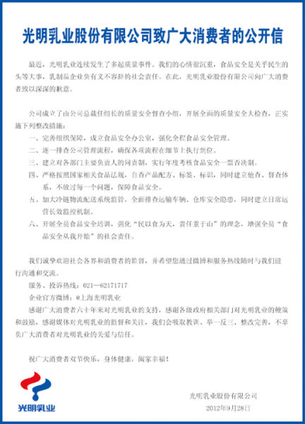 最近,光明乳业连续发生了多起质量事件。我们的心情很沉重,食品安全是关乎民生的头等大事,乳制品企业负有义不容辞的社会责任。在此,光明乳业股份有限公司向广大消费者致以深深的歉意。