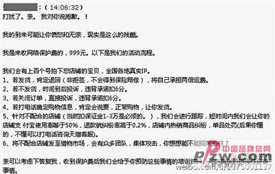 “淘宝商城”一位商家收到的敲诈信息,“收网络保护费999元”。网络截图