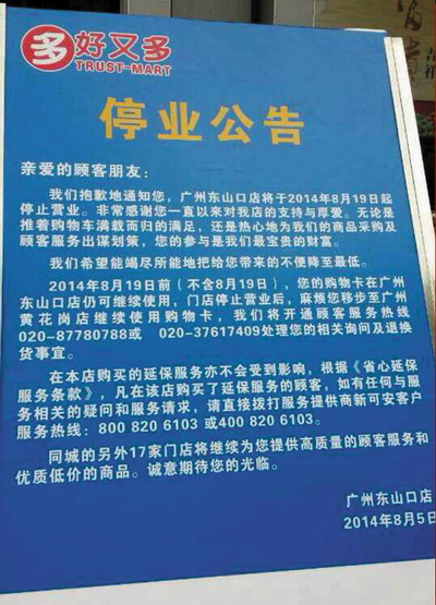 外资零售业的关店潮从去年至今都没有停歇的迹象。昨日,有读者报料称,广州东山口的好又多将停业。记者来到现场向该店的相关店员了解到,该店因面临亏损不得不关店。