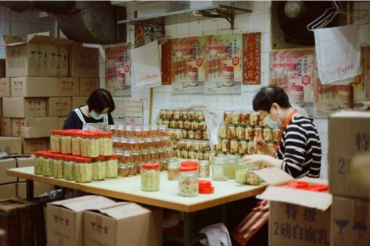 走进店内,腐乳的味道扑面而来。店铺约四十几平方米,呈狭长布局,前台货架上摆放着腐乳和其他酱料。穿过一道门,后面是制作和包装产品的作坊,廖家雇用了两位工人,负责将腐乳块和酱料装进透明玻璃罐。