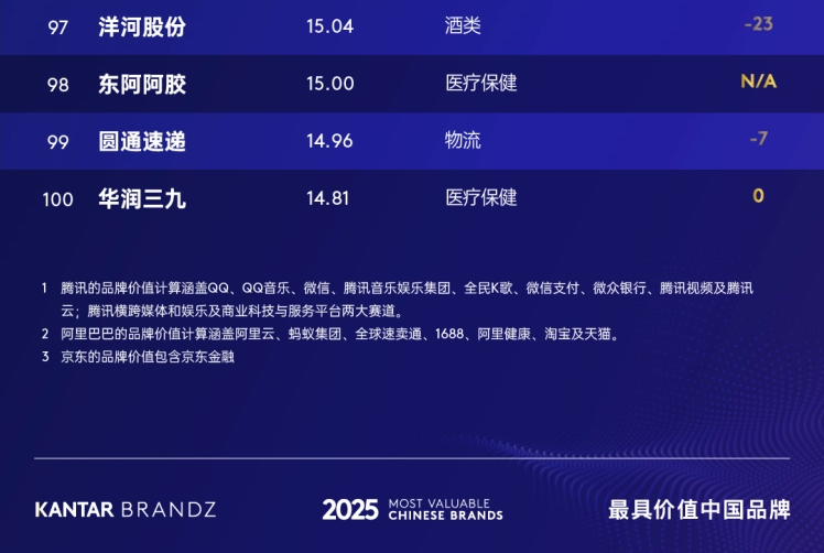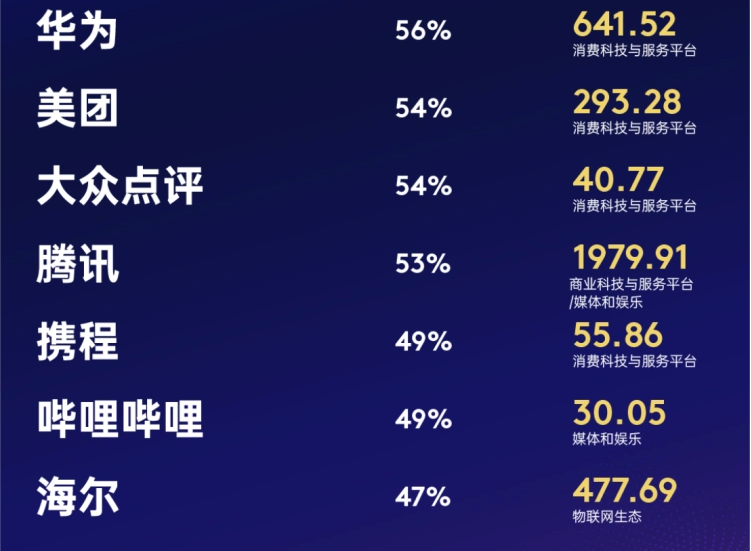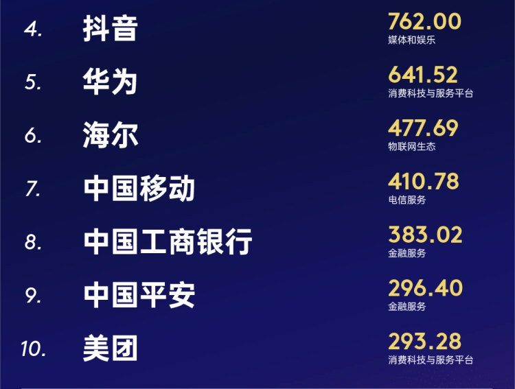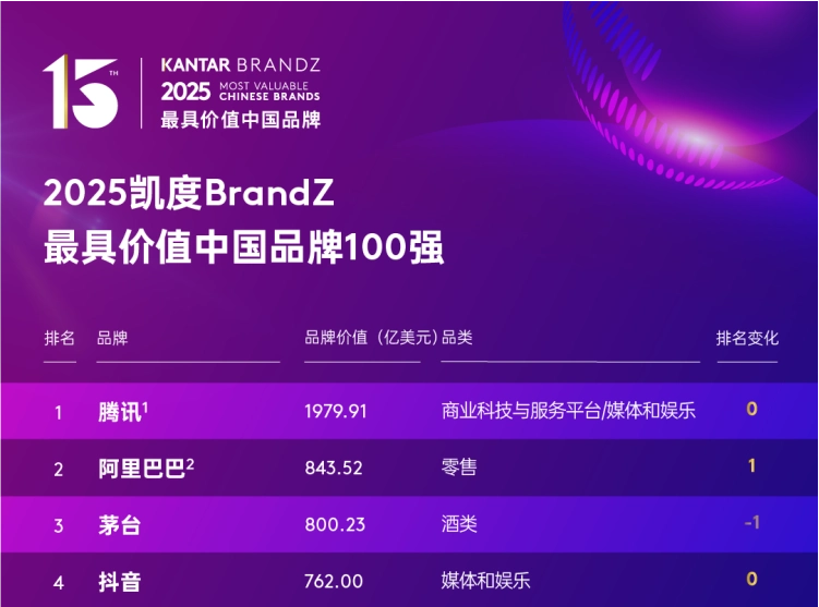 今年品牌百强榜中,腾讯以1979.91亿美元品牌价值强势卫冕,连续五年居首,价值涨幅53%。阿里巴巴品牌增速23%价值843.52亿美元,重回亚军宝座。茅台以800.23亿美元品牌价值稳居季军,抖音品牌价值上升34%至762亿美元,保持第四名。华为表现尤为亮眼,品牌价值同比增长56%达641.52亿美元,不仅稳居总榜第五位,更跻身年度价值增长领先品牌前四强;海尔(第6名,477.69亿美元)进一步巩固了其在物联网生态的领导地位。