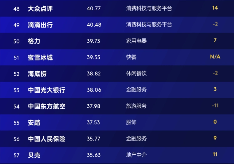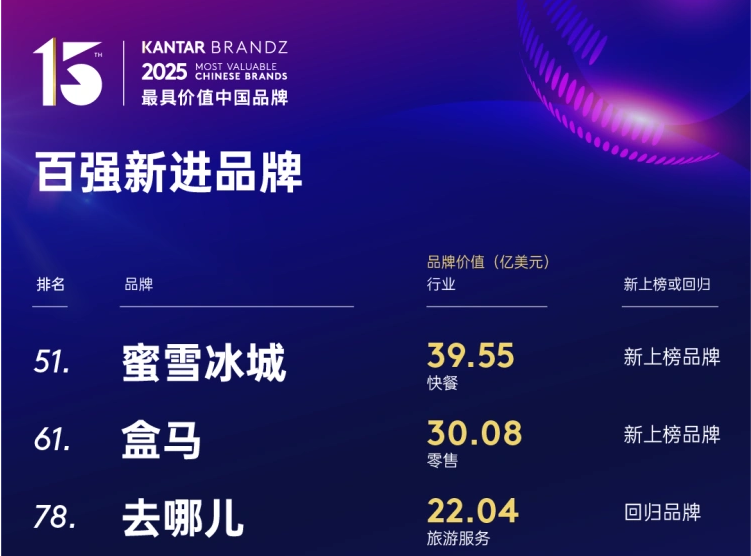 今年,七大品牌新入百强榜,其中三家首次、四家回归。快餐行业表现抢眼,独占两席:蜜雪冰城(第51名,39.55亿美元)是首次入选品牌中排名最靠前的;另一家是霸王茶姬(第88名,18.17亿美元);回归品牌排名最高的去哪儿(第78位,22.04亿美元)。