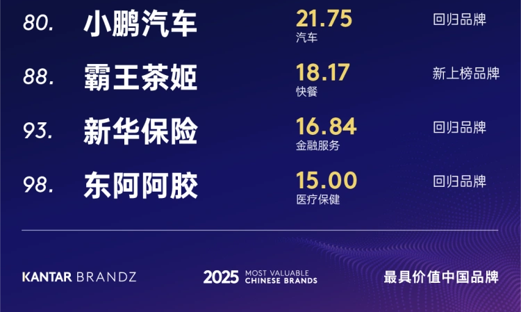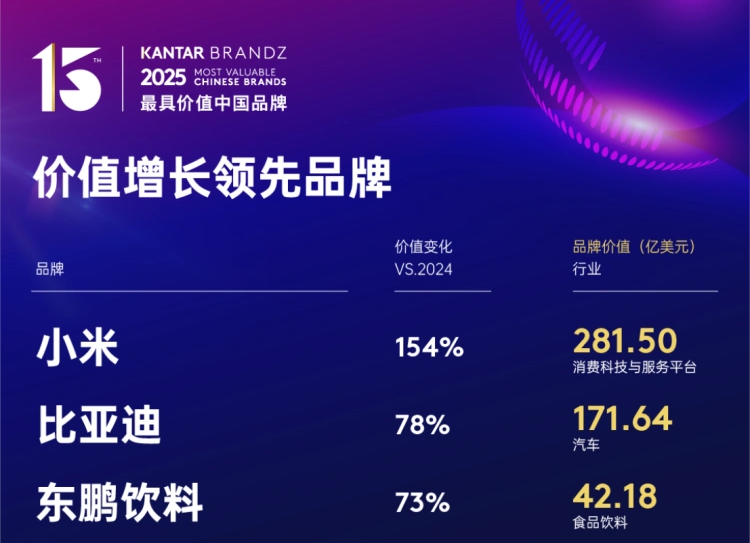 本年度价值增长领先品牌的平均增速高达67%,展现出中国品牌强劲的发展动能。其中,小米(第11名,281.50亿美元)以154%的增速领跑,东鹏饮料(第44名,42.18亿美元)创新领跑传统产业转型升级,进一步巩固了其国民品牌地位。新能源汽车行业迎来爆发式增长,比亚迪(第18名,171.64亿美元)以78%的增幅列增速第二,其持续突破的智驾技术和不断拓展的战略合作伙伴关系成为推动品牌价值跃升的双引擎。同期,小鹏汽车(第80名,21.75亿美元)凭借海外市场拓展强化品牌竞争力,重返百强。