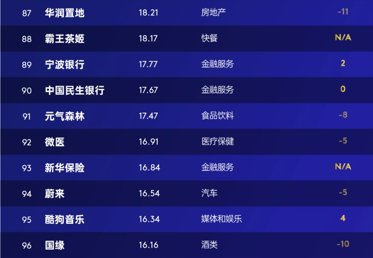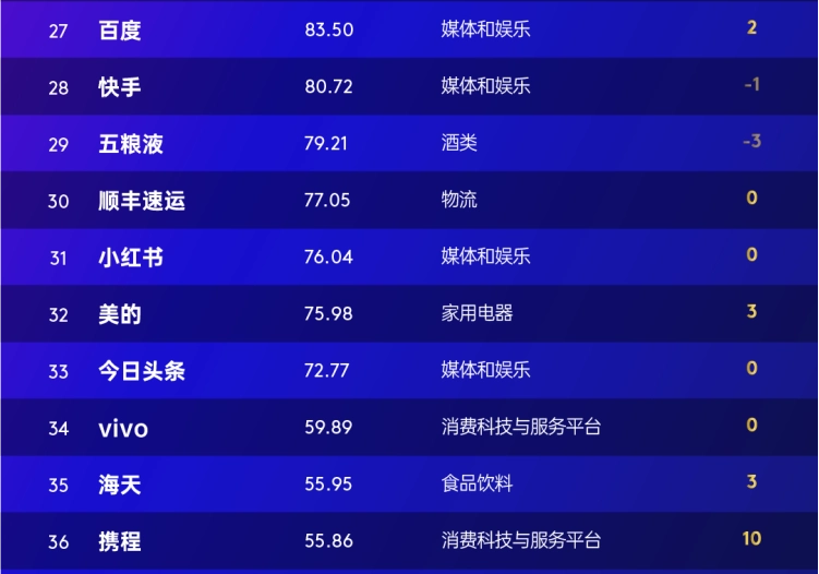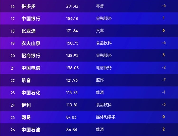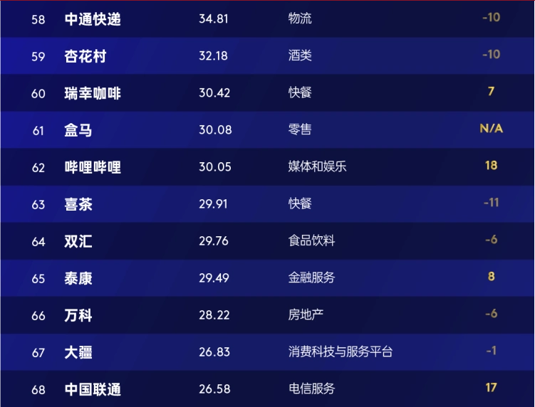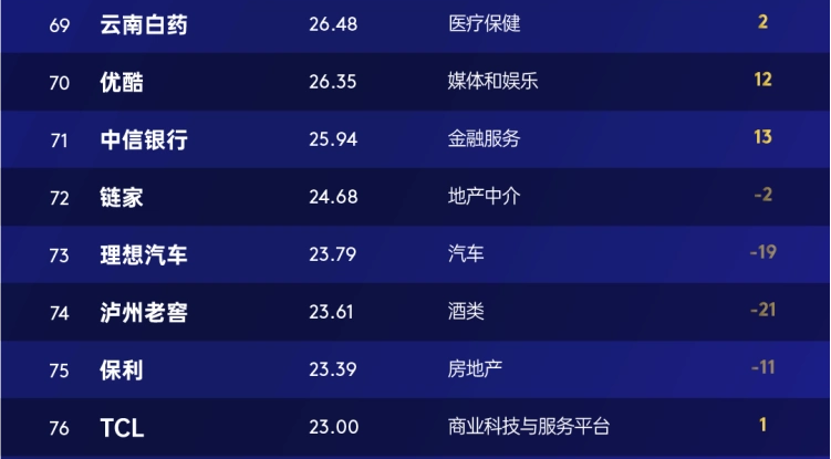 媒体和娱乐行业11个品牌上榜贡献百强总价值27%,两家茶饮新入榜