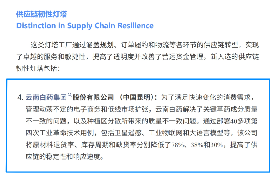 在新入选的灯塔工厂中,云南白药智慧工厂因供应链韧性而获授殊荣。
