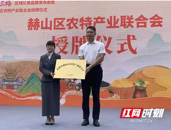 活动现场举行赫山区农特产业联合会授牌仪式,并为赫山区农特产业联合会秘书长发放聘书。赫山区农特产业联合会负责“赫山三禧”区域公用品牌的使用,区城投公司被授权经营首家“赫山三禧”旗舰店。