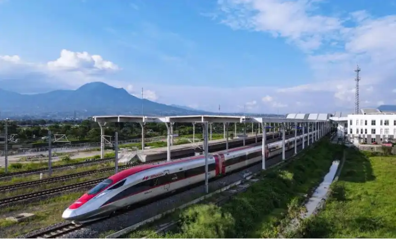 5月20日,在印度尼西亚万隆,一列雅万高铁高速动车组列车驶出德卡鲁尔站(无人机照片)。新华社记者 徐钦摄