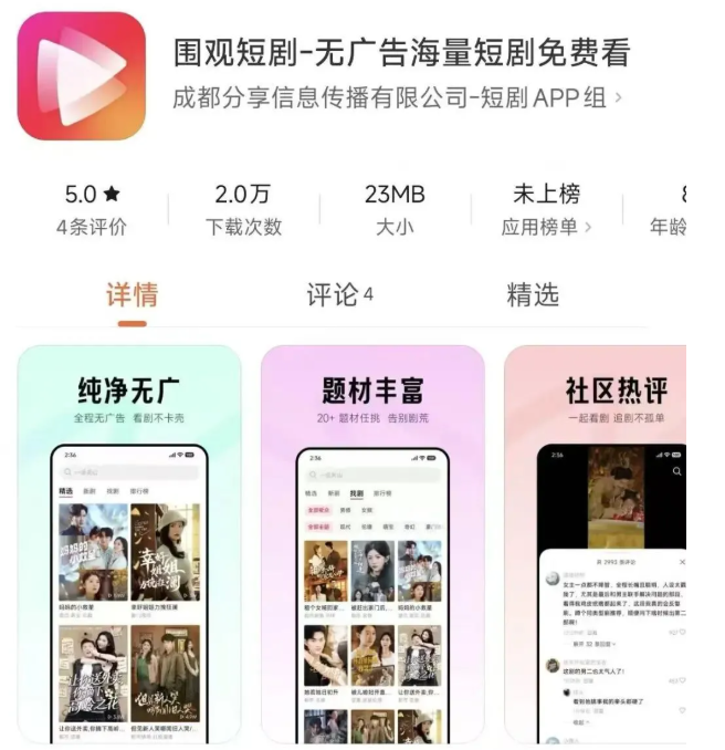 记者获悉,小米应用商城近日悄然上线了一款名为“围观短剧”的短剧APP。记者注意到,该应用早在9月30日就已更新,目前下载量已达2.0万人次。