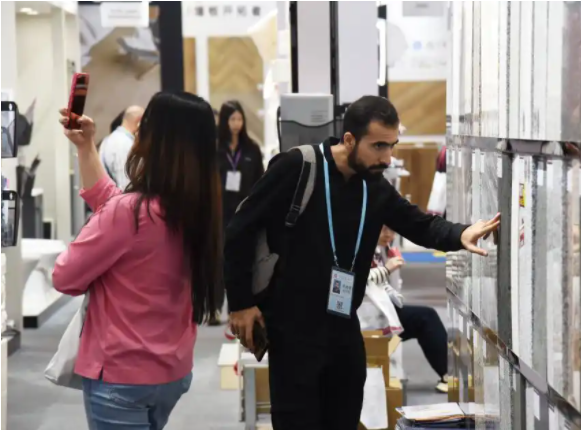 10月27日,采购商在第138届广交会第二期展会上查看建材产品