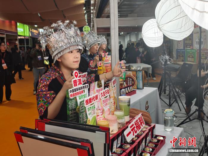 12月5日,三位主播在2025中国(普洱)国际咖啡博览会上通过直播销售云南普洱的特色咖啡产品。中新社记者 韩帅南 摄