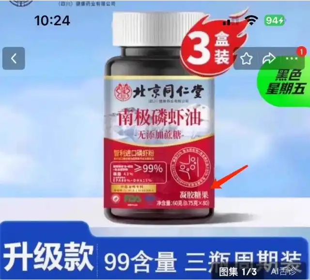 事件的发酵源于上海市消保委对市售15款南极磷虾油产品的对比抽检。在这次检测中,一款标称“北京同仁堂”品牌、经销方为北京同仁堂(四川)健康药业有限公司的产品引发关注。该产品外包装明确标识磷脂含量为43%,并印有“智利进口原料”“1粒≈100只磷虾”等字样。
