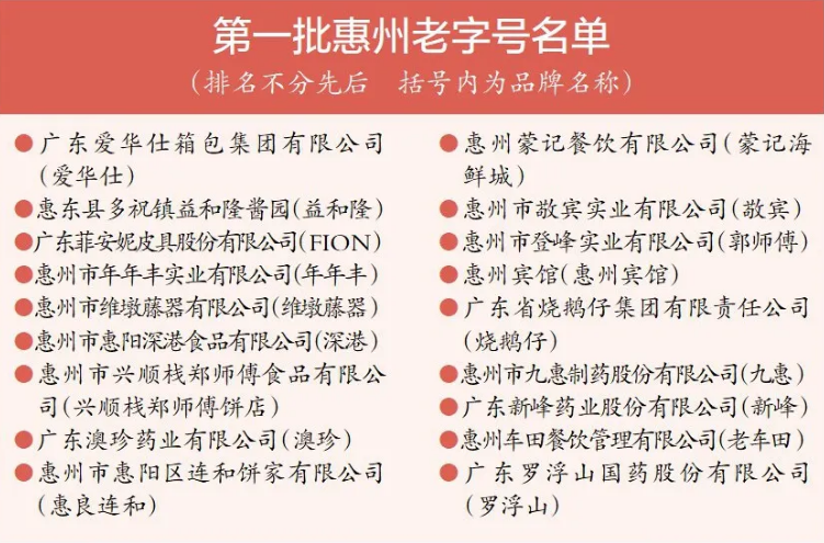 摘要:12月18日,惠州市商务局发布《关于公布第一批惠州老字号名单的通知》,认定18个品牌为第一批惠州老字号。