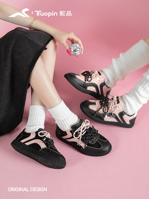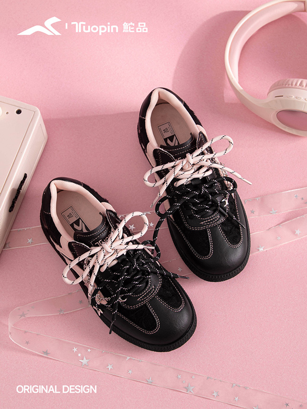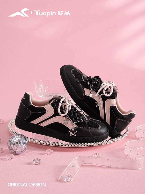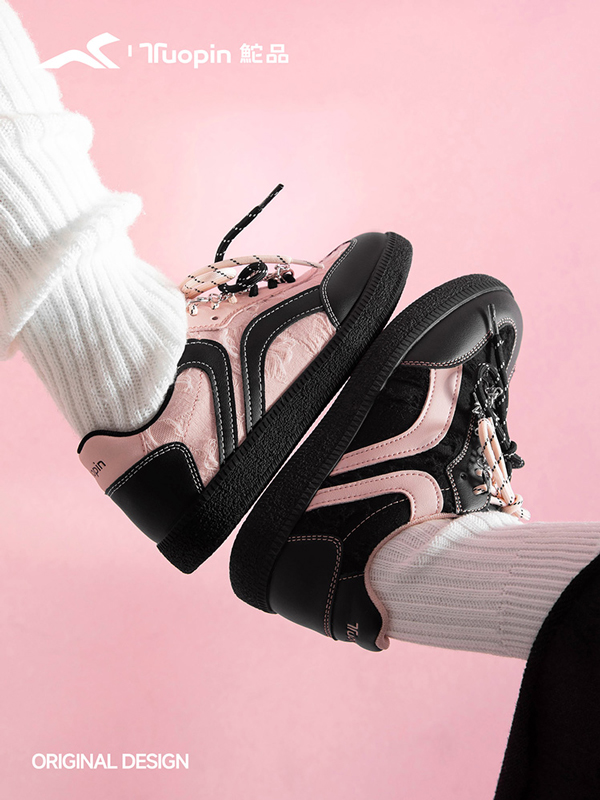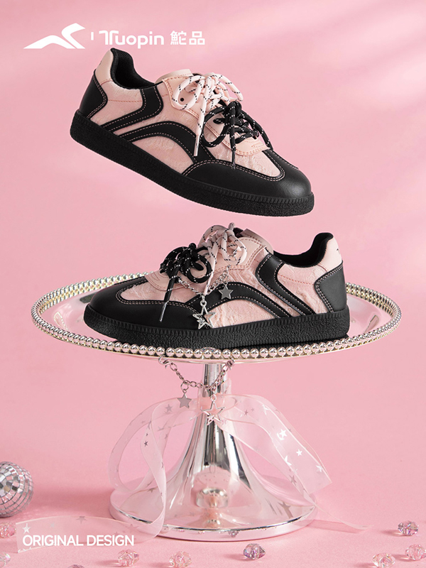 沉稳的黑色奠定整体基调,辅以跳脱的粉色,这种打破常规的颜色配比在当下强调个体性和追求自主性的世代中深受欢迎。国货休闲品牌鮀品抓住当下潮流与大众的穿着需求,鼓励消费者不被拘泥于单一的风格之中,通过这两双黑粉配色德训鞋告诉粉丝,在低调内敛与个性表达之间,同样能找到平衡点。