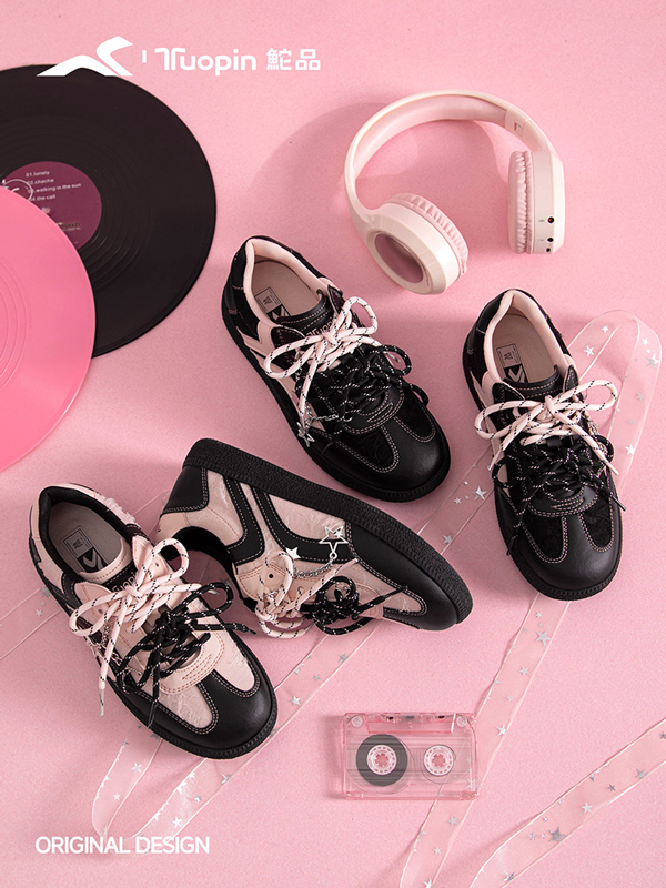 在沉静冷酷的黑色中加上一抹亮眼的粉色,如同有一丝丝甜蜜的糖浆悄悄往外溢出,正是当下推崇“轻亚风”穿搭的年轻世代最喜欢的配色之一。国货休闲品牌鮀品推出粉黑配色德训鞋,为用户开拓更多穿搭风格。